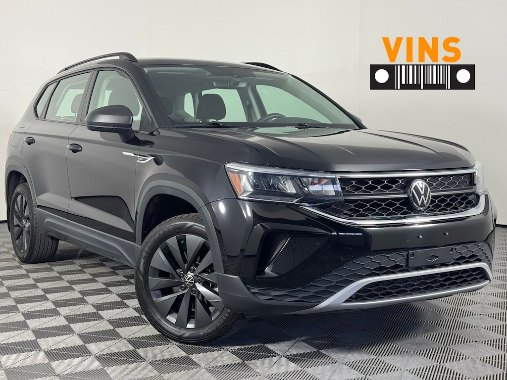 Clean CARFAX. CARFAX One-Owner. Black 2023 Volkswagen Taos 1.5T S FWD 8-Speed Automatic with Tiptronic 1.5L I4 Turbocharged DOHC 16V LEV3-SULEV30 158hp Cloth Seating Surfaces, Electronic Stability Control, Exterior Parking Camera Rear, Fully automatic headlights, Outside temperature display, Power door mirrors, Rear window defroster, Rear window wiper, Remote keyless entry, Speed-sensing steering, Spoiler, Steering wheel mounted audio controls, Wheels: 17" Silver Painted Alloy.